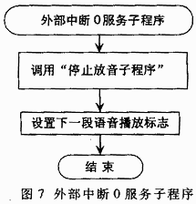 按照前面的分析和硬件原理图,软件部分主要涉及启动录音和停止录音、启动放音和停止放音、检测EOM信号的外部中断0、定时中断等六个子程序模块。播放语音时,语音段尾的EOM信号触发外部中断0,进入服务子程序。首先停止语音播放,然后设置下一段语音播放标志。各个语音段的组合播放顺序由主程序根据外部情况或设置情况自动变动,如在电缆故障自动定位仪中,测试出故障点后,根据故障点的距离组合存放数字的各个语音段进行播放。定时中断采用工作方式2,定时周期为5ms。为产生ISD25120每个信号段的200ms时间,设置一个定时计数器,计满40次定时周期即得到200ms的时间,产生一次中断。六个子程序模块的软件流程如图3~图8所示。
