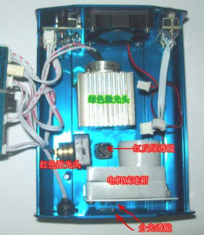 两只激光头都照到了一个45度位置的镜片上,对于绿色激光,这只镜片相当于平面透镜直通,对于红色激光,这只镜片相同于平面反射镜转弯90度后和绿光变成重合的平行光,射向出光口。生产出这样的镜片到底包含有多少科学道理和需要什么样的技术手段,站长就不得而知了。